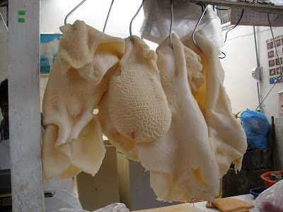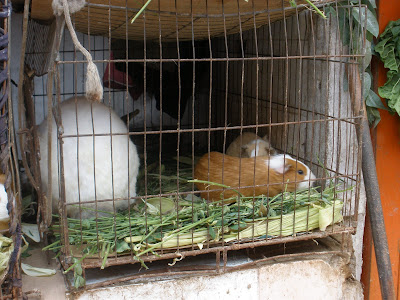 Today we visited the Magdalena Market in Peru. This a typical Peruvian outdoor market where the locals go to get all of their goods. There are supermarkets in the wealthy areas but they are very expensive. In these markets it is important to know your source. You can see from all the meat and fish hanging and lying around in the open that this could present some problems. they eat all kinds of different things we wouldn’t think of touching. Guinea pigs for one. We watched them kill one (slit its throat). They eat chicken feet cow stomach, intestines and heart to name a few others. There are some interesting veggies as well. They have about 30 varieties of potatoes, a HUGE squash (can’t remember the name), many kinds of beans and grains and some of the largest kernels of corn I have ever seen. You can also find ground coca leaves and probably the leaves themselves in the market. I am not sure if it is legal to sell it or not. They put it in the yogurt for breakfast and they also have coca tea in most restaurants so I know that is legal. I think it is grown in the north near Columbia and also in the Cusco area. Notice the photo of me holding a large bag of ground Coca – just for some humor. I have tried the Coca tea and it just tastes like herbal tea to me. I don’t notice any different after drinking it. I think I will stick with my coffee. It is supposed to help with altitude sickness so they say I should drink it for 2 days prior to leaving for Cusco and while I am there. Maybe its a blood thinner or something. Anyway, back to the market. It was certainly a feast for some of the senses – smells and sights for sure. The corridors are very narrow – you may be able to tell this from the video (its bit shaky due to the tightness of the area). The vendors specialize – chicken only, beef only, grains, sundries, fish, cooked food (like little fast food counters), rabbits and guinea pigs, fruits and vegetables. There are very few that have more than one specialty – no WalMarts here! It is a giant maze of stalls winding around at least one city block. Then outside the food market are the other shops. They bootleg videos and you can buy just about any video for $1. You should see the ladies lingerie – for a Catholic country they are sure selling a lot of racy undies! Shoes, clothes, drugstores, candy stores, dog food stores, etc. All specialties. Its a a real zoo. If I get to go again I will try to write down more notes. It all went by so fast I am sure I am forgetting to cover a lot.