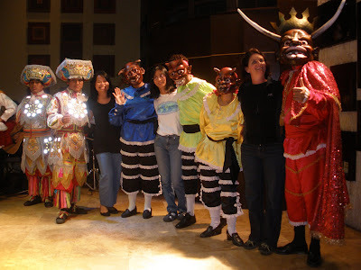 Last night we went to the Peruvian Dinner Theater. These are a few photos from the tradional dances of Peru. The one with the large head is like the lucky Buddha of Peru. The show had dances from many of the areas and cultures of Peru – Lima, Cusco (Inca), Puno, Ica and other coastal regions. The costumes were very colorful. My favorite dance was the scissors dance. These two men dance with the two components of a pair of scissors in their hands keeping a constant rhythm while they tumble and dance around. They were pretty amazing. I will post a video so that you can hear the music and write about the dances a bit later.